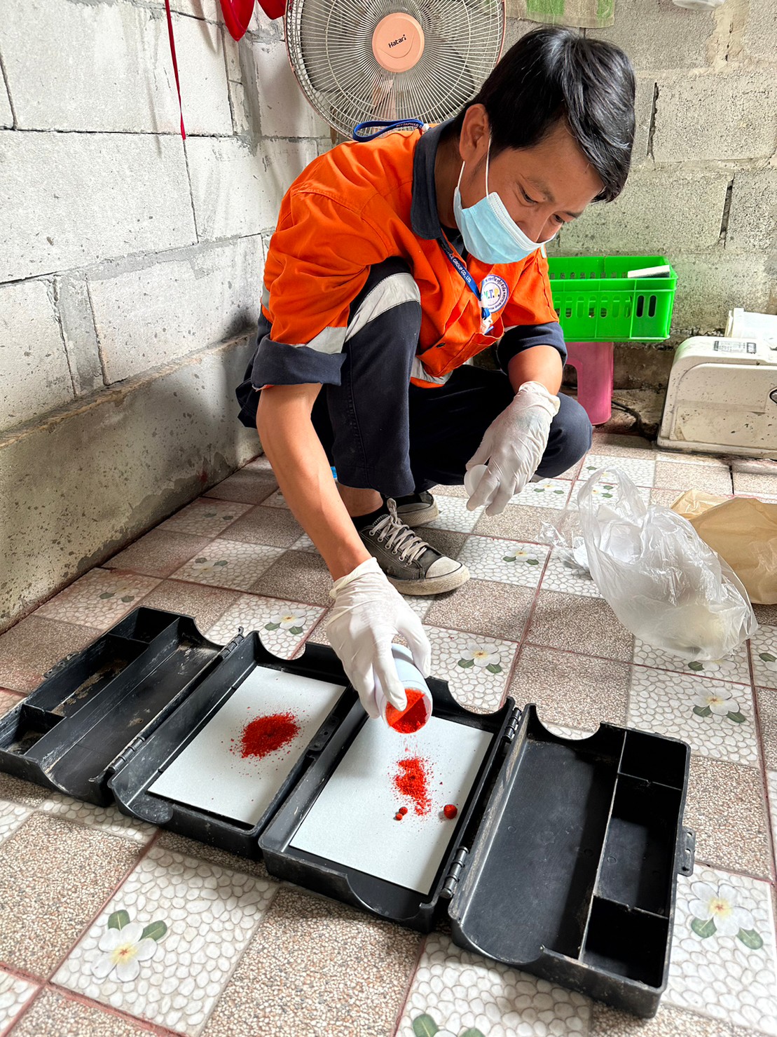 - กำหนดจุดวางเหยื่อทั้งภายในและภายนอกรอบตัวอาคารอุปกรณ์ที่ใช้สำหรับวางเหยื่อพิษสำเร็จรูปได้แก่ กล่องท่อพีวีซีเส้นผ่านศูนย์กลางประมาณ 3-4 นิ้ว เป็นต้น